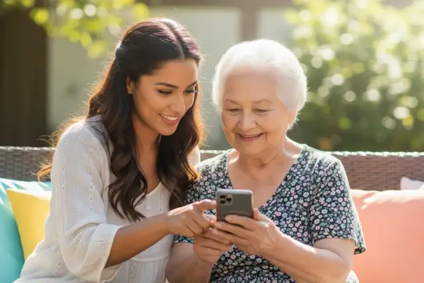 Uma senhora sorridente interage com um smartphone moderno ao lado de uma mulher mais jovem, possivelmente sua neta, em um ambiente ao ar livre iluminado pelo sol. A jovem orienta a idosa com carinho, demonstrando conexão entre gerações e inclusão digital. A cena transmite acolhimento, confiança e facilidade no uso da tecnologia por pessoas acima de 60 anos.